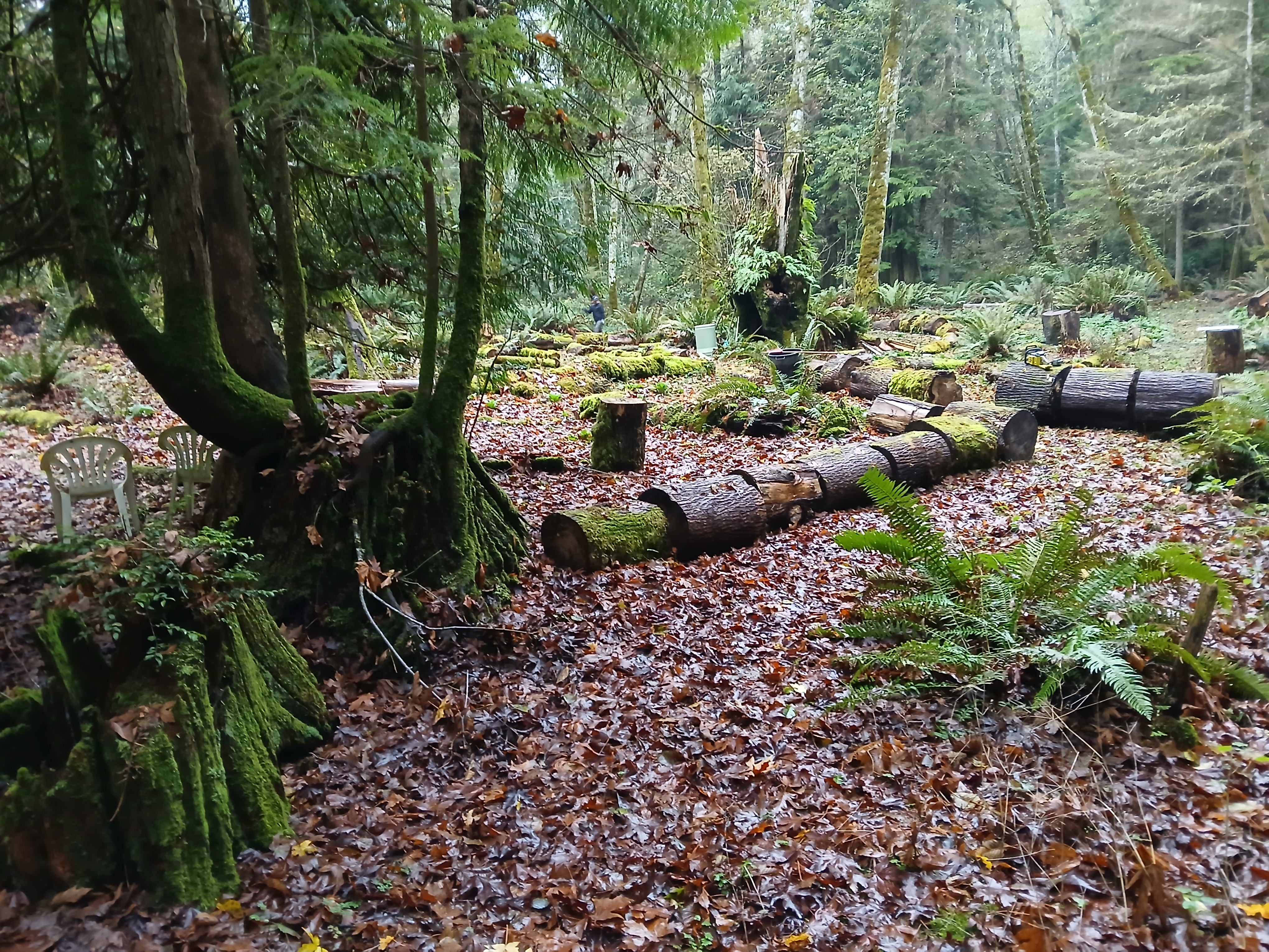 Getting back to approaching the labyrinth, you will approach four mostly straight rows of logs forming a cross at the center of the labyrinth, and you will turn left at the cross into ring five of the labyrinth. You will quickly see that the paths differ from perfect curvature wherever there is a tree or stump in the way. Ring five goes almost back to the starting point where there is a switchback to ring six. Between rings five and six you will see the stump of the big leaf maple that collapsed in the 2024-5 winter.