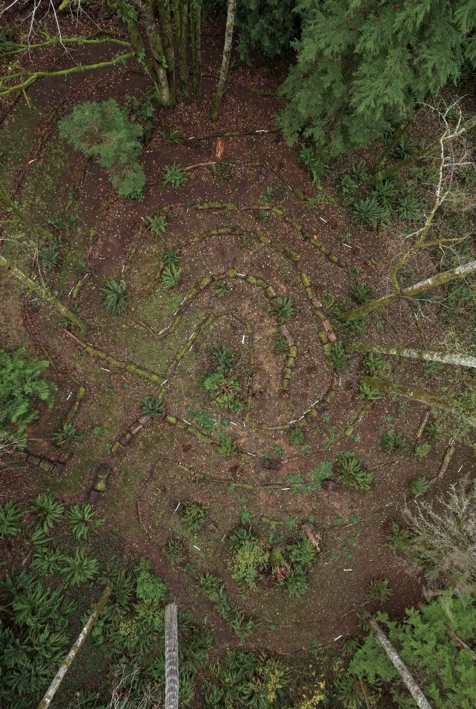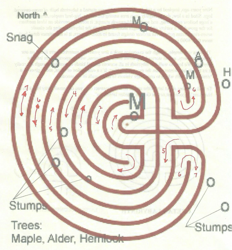 Inspired by a talk by Betty Hawkins in 2006, we started a labyrinth built of moss-covered logs. Sited in a low, damp, slightly open area among tall cedars, big-leaf maples, large old alders, a huge hollow cedar snag, and several old-growth stumps, it seems to provide an ideal medium for the growth of a variety of lush, bright mosses. We built the labyrinth using the classic seven-ring Cretan pattern. An ancient design found in most cultures; it is sometimes dated back more than 4000 years.